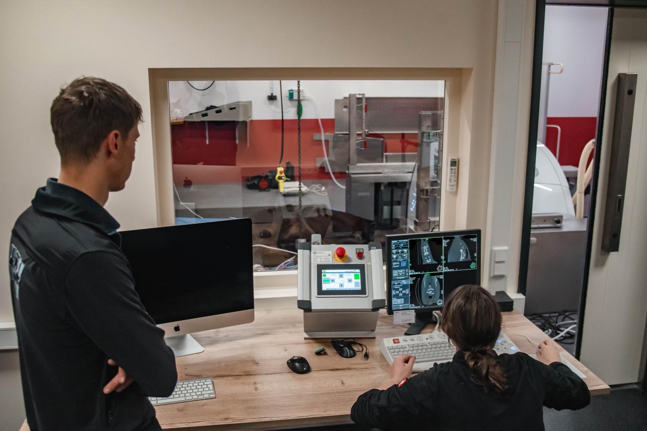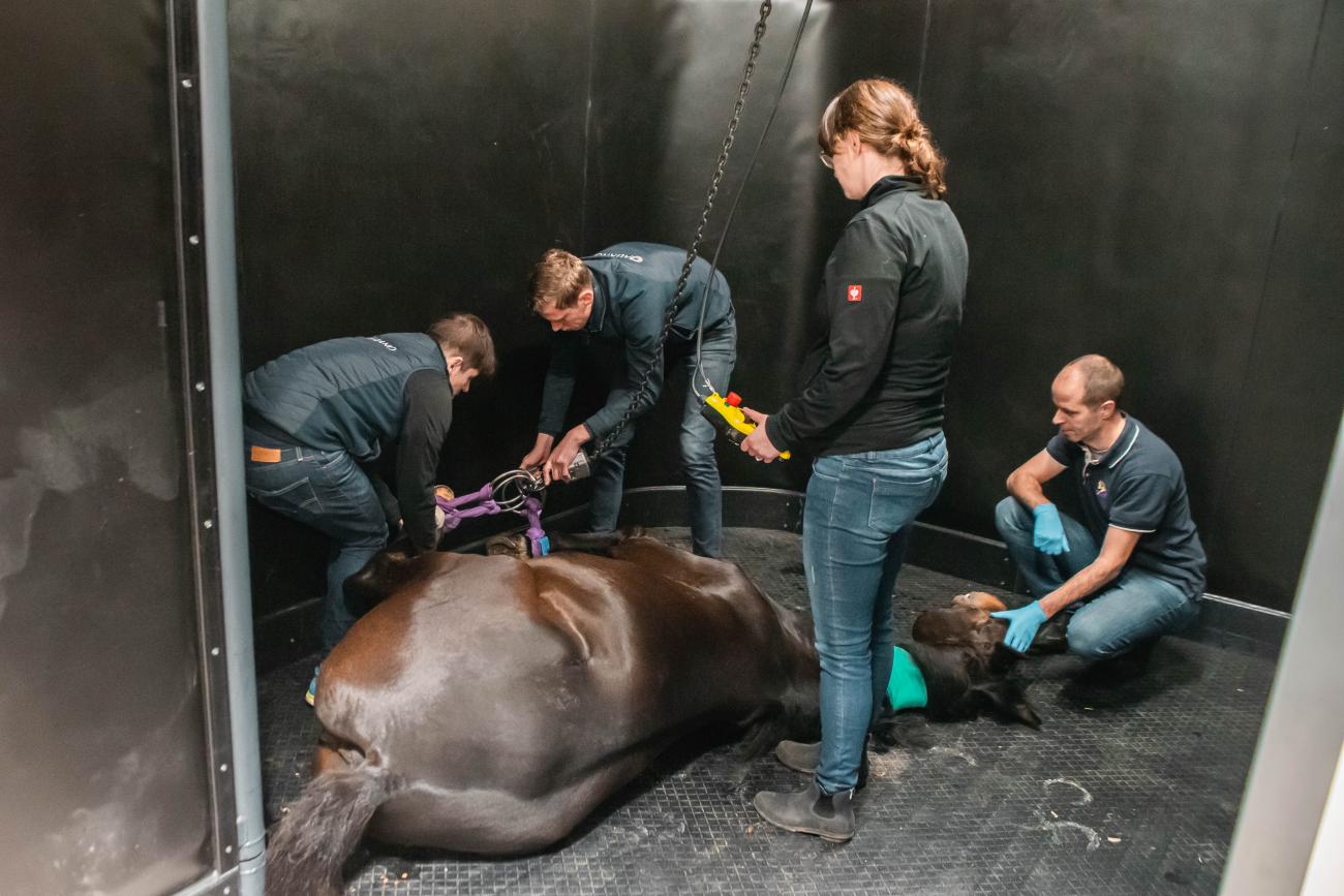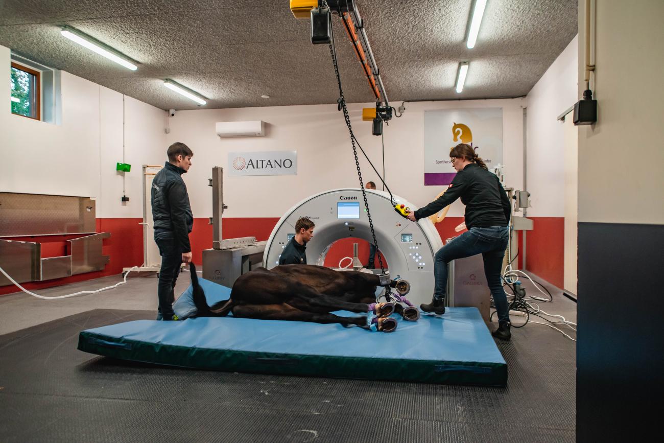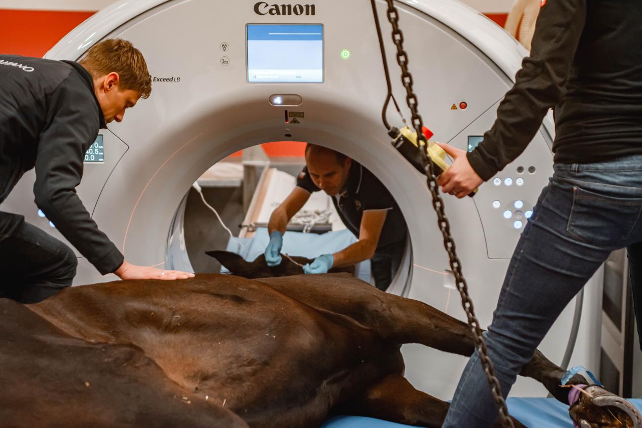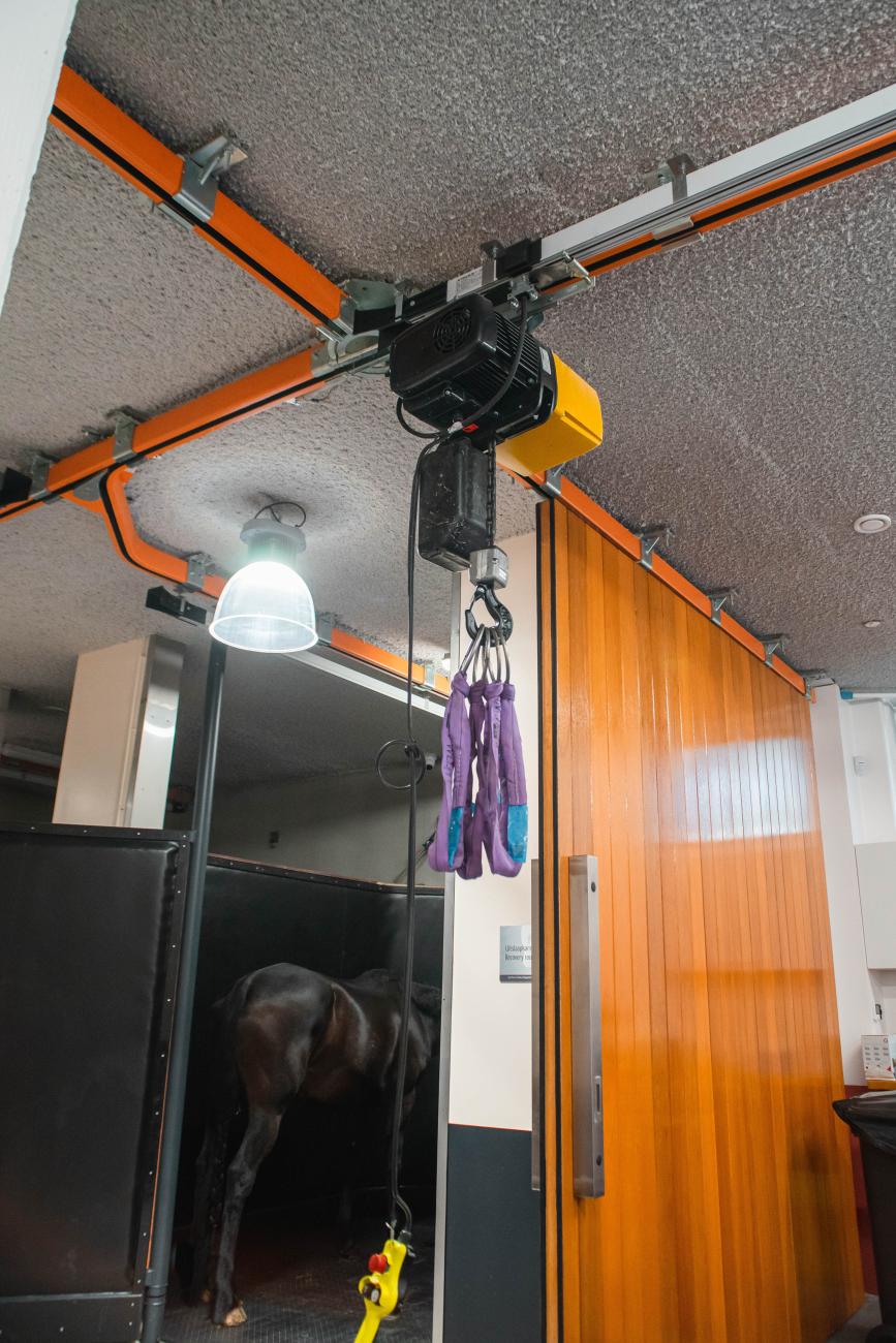 The animal is placed under general anaesthesia in one of the two waiting stalls, after which it is hooked onto the hoist and carried carefully to the CT scanner where the staff repositions the horse into place, before running the scan. After the procedure is complete, the horse is taken back o the stall where it is slowly brought back to consciousness.
