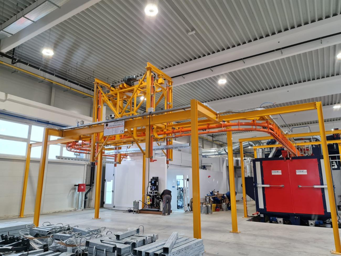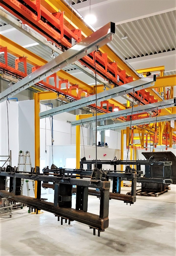 The system consists of 130m of track, 2 drop sections of 500kgs each, 4m long load bars and a transfer through a shot-blasting machine.