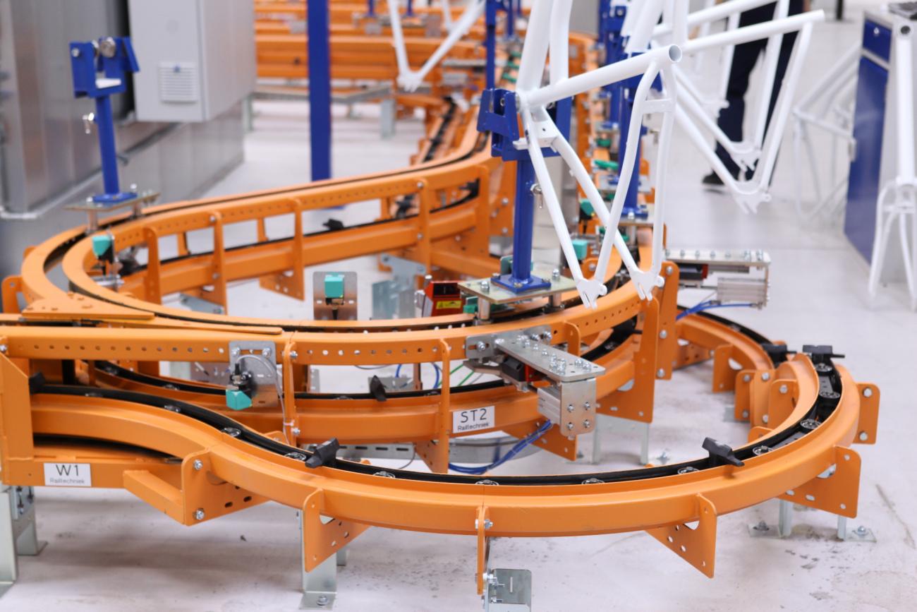 An F1 floor conveyor can be fitted with the same components as the T1 overhead system. Standard switches, horizontal and vertical bends, drive units, stop stations, and lubrication units are available to design an optimal layout.